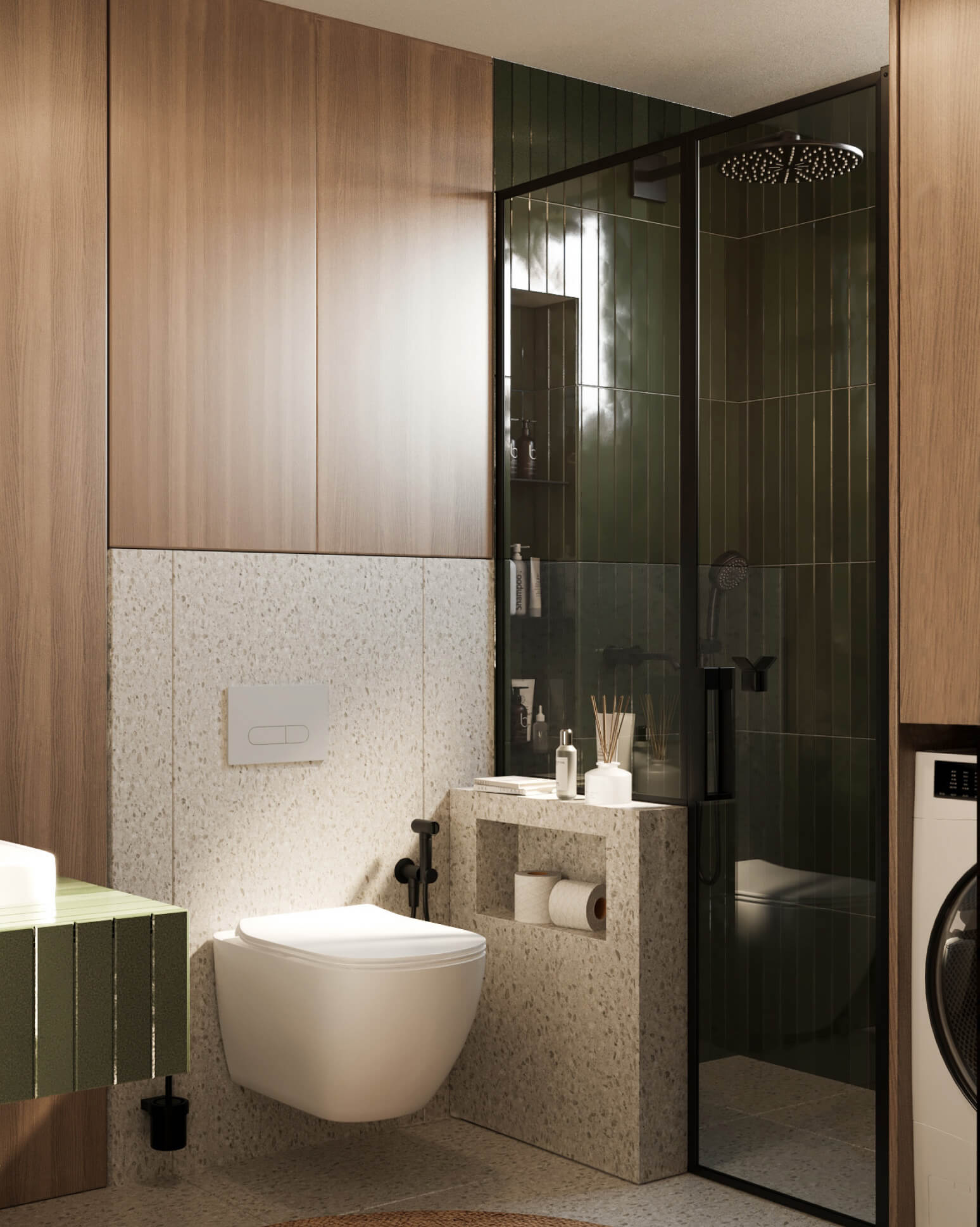 Kupatilo nastavlja istu dizajnersku priču, ali u smirenijem, intimnijem tonu. Zidne obloge u tamnozelenim nijansama, u kombinaciji sa teksturom teraco kamena i toplim drvenim frontovima, stvaraju sofisticiran, gotovo spa ambijent.