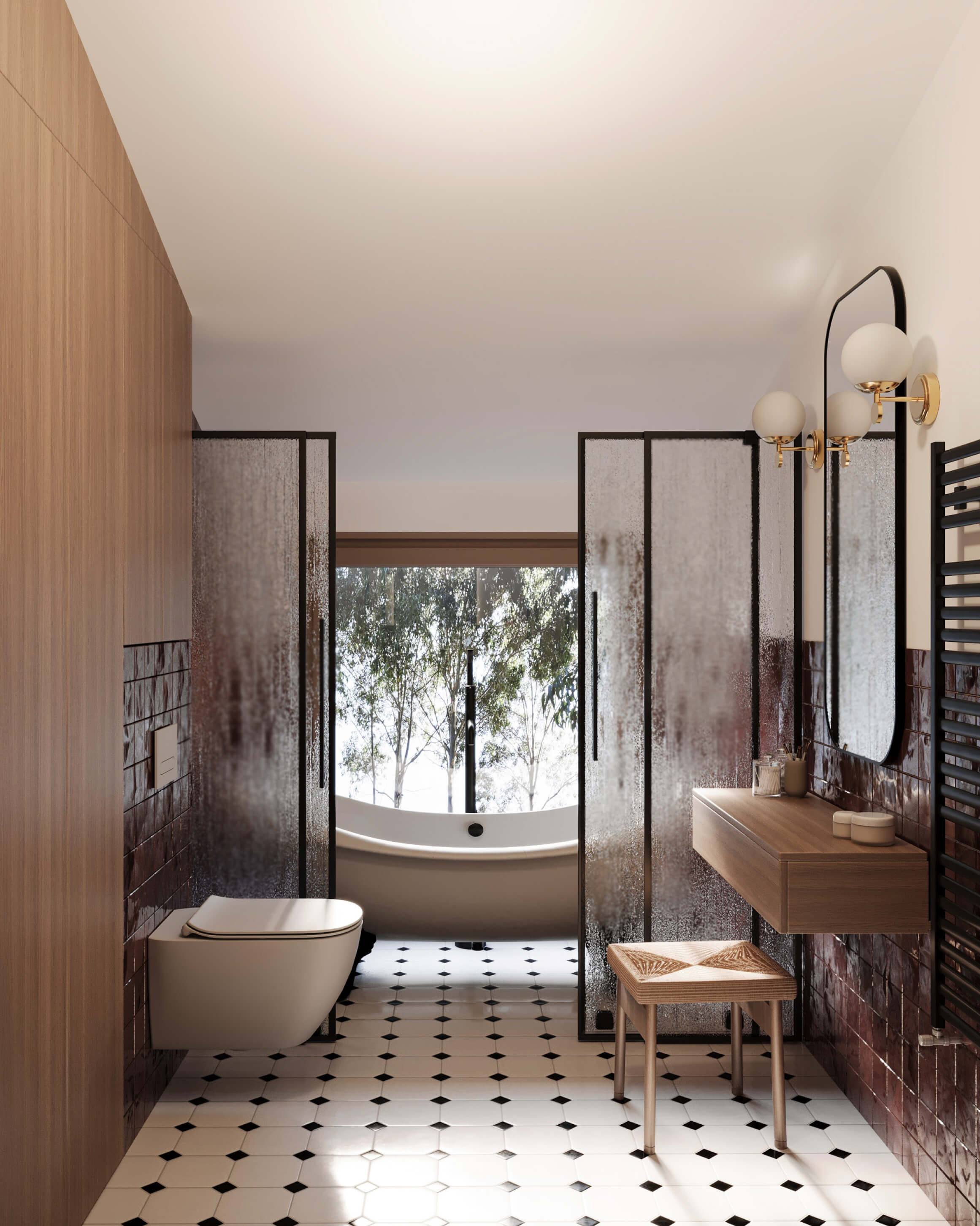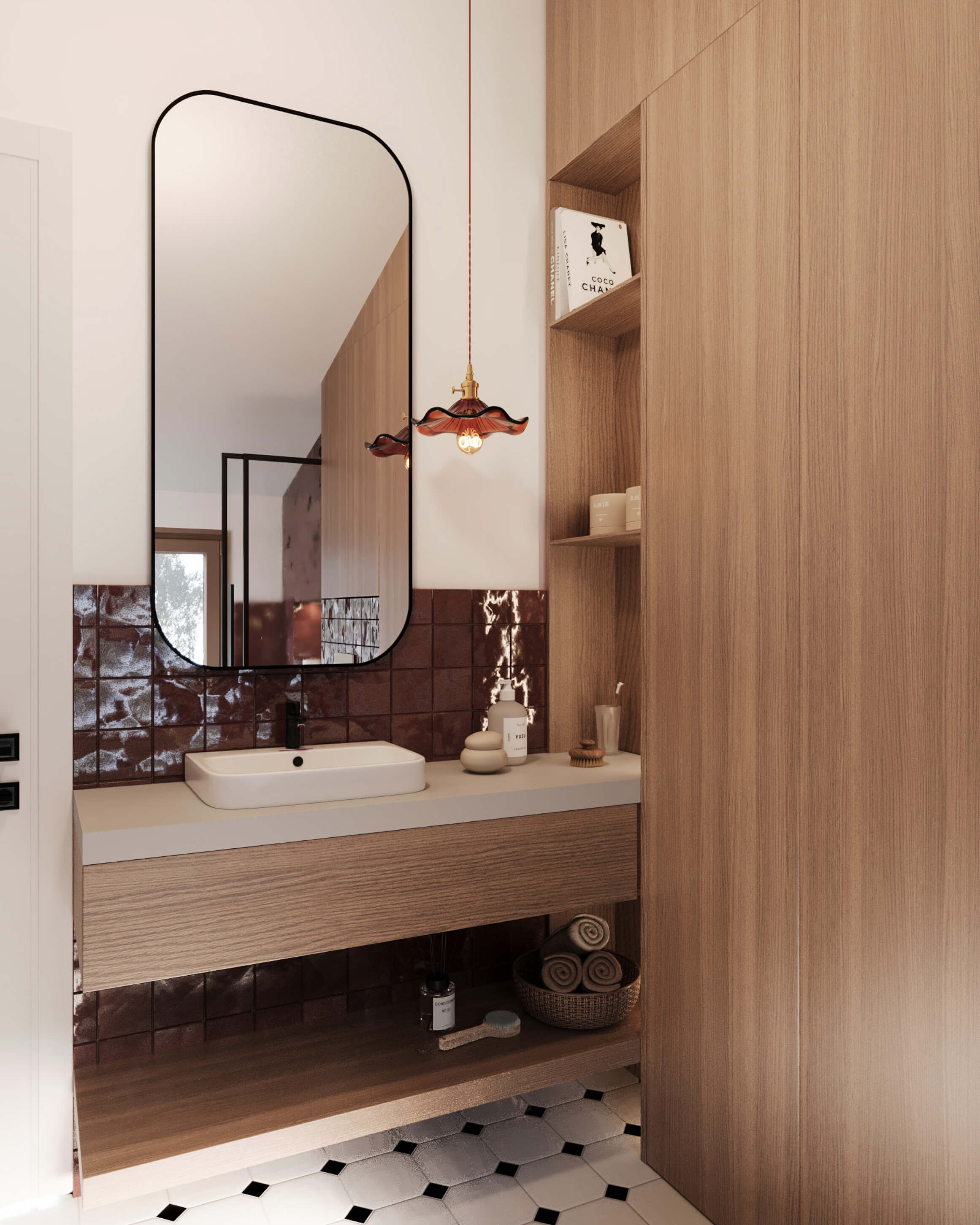 Minimalistička sanitarija i crni detalji daju savremeni kontrast, dok diskretna rasveta naglašava dubinu materijala.