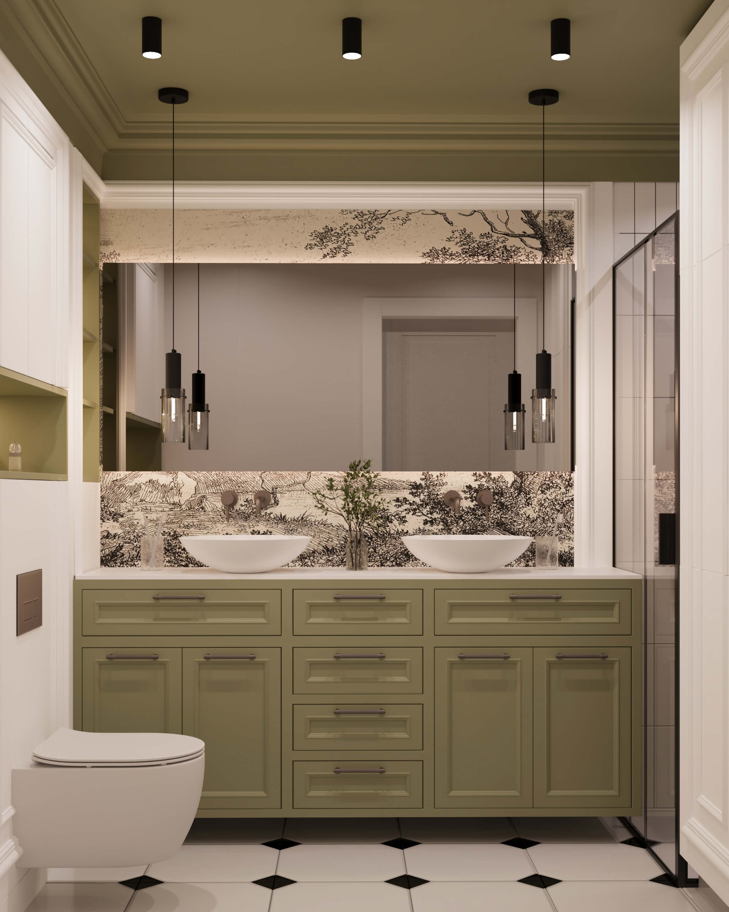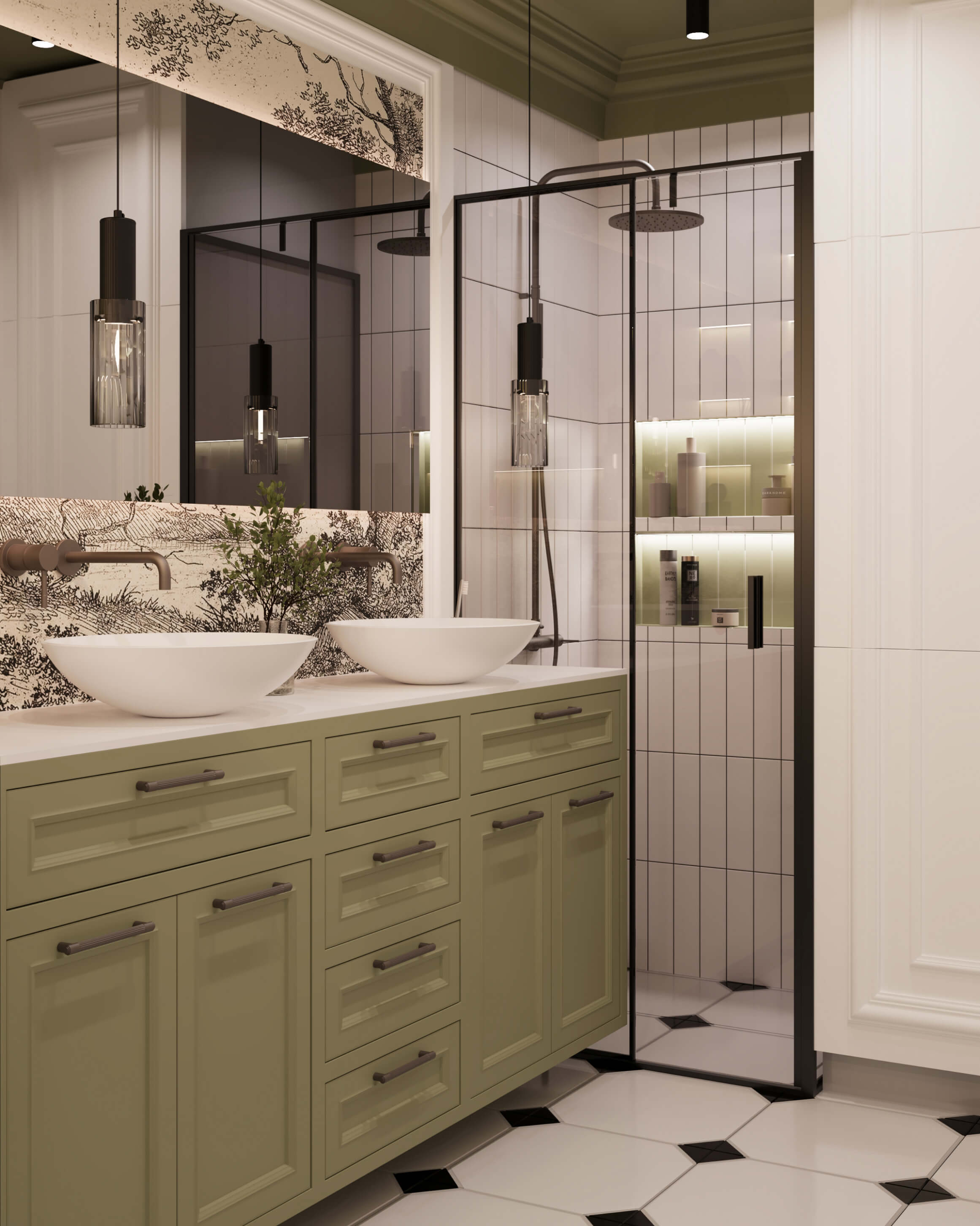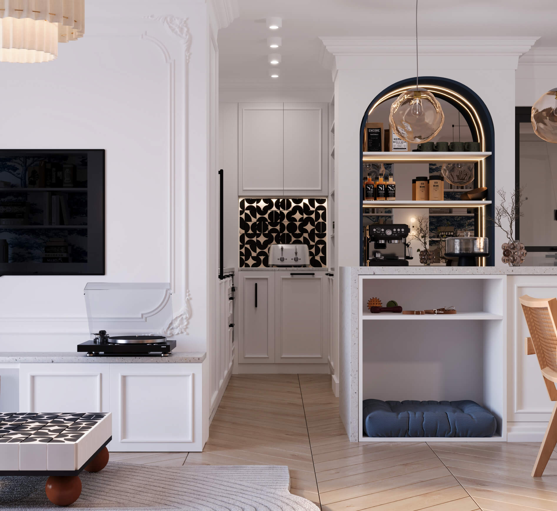 Prostor je definisan svetlom osnovom – belim zidovima, diskretnom lamperijom i profinjenim lajsnama – koje čine neutralnu scenografiju za slojevito oblikovan enterijer.