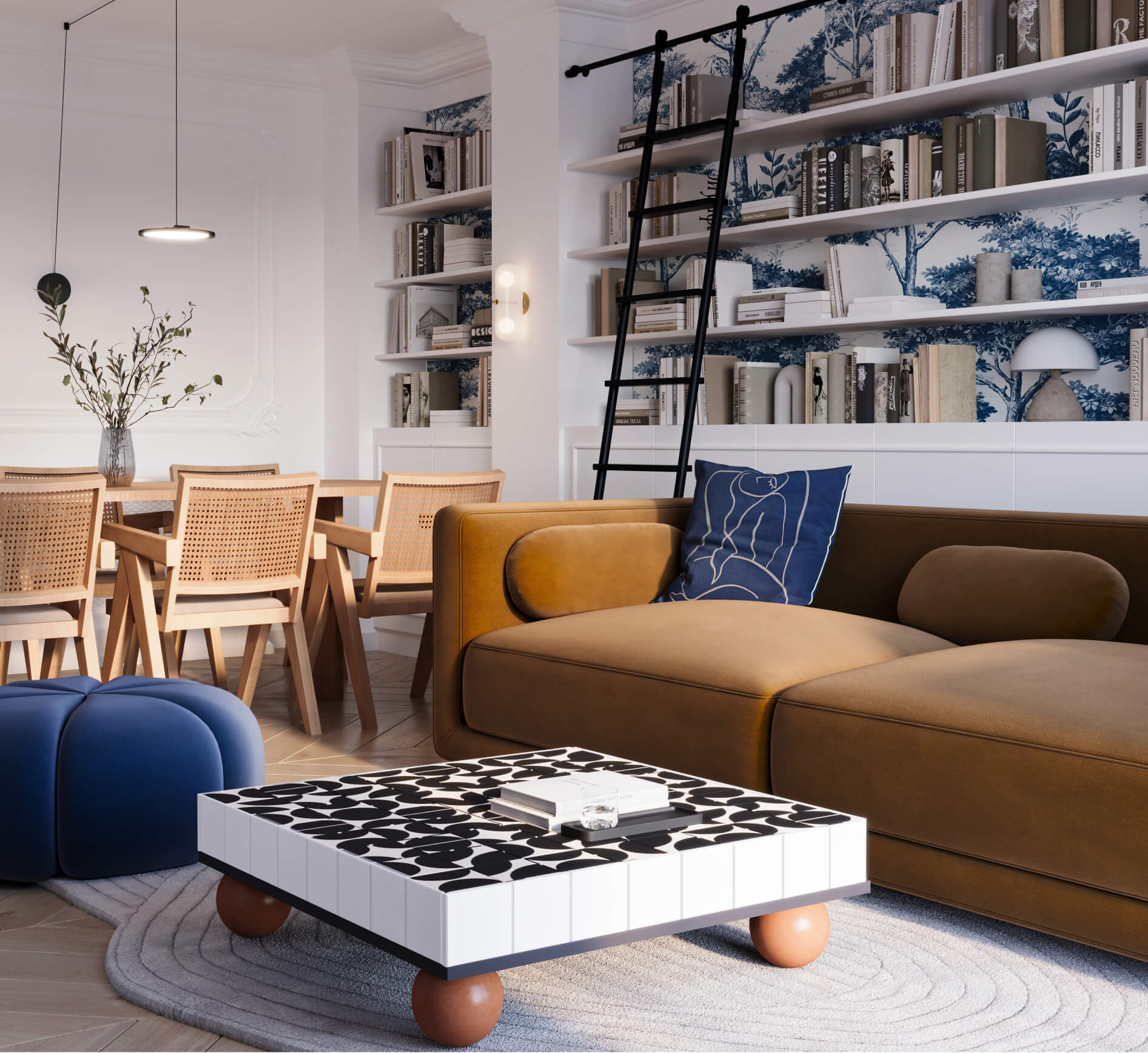 Poseban identitet prostoru daje zidna biblioteka uokvirena tapetom sa klasičnim motivima u plavoj boji, uz diskretnu crnu merdevinu, ne služi samo kao mesto za knjige već postaje arhitektonski fokus i simbol intelektualnog doma.