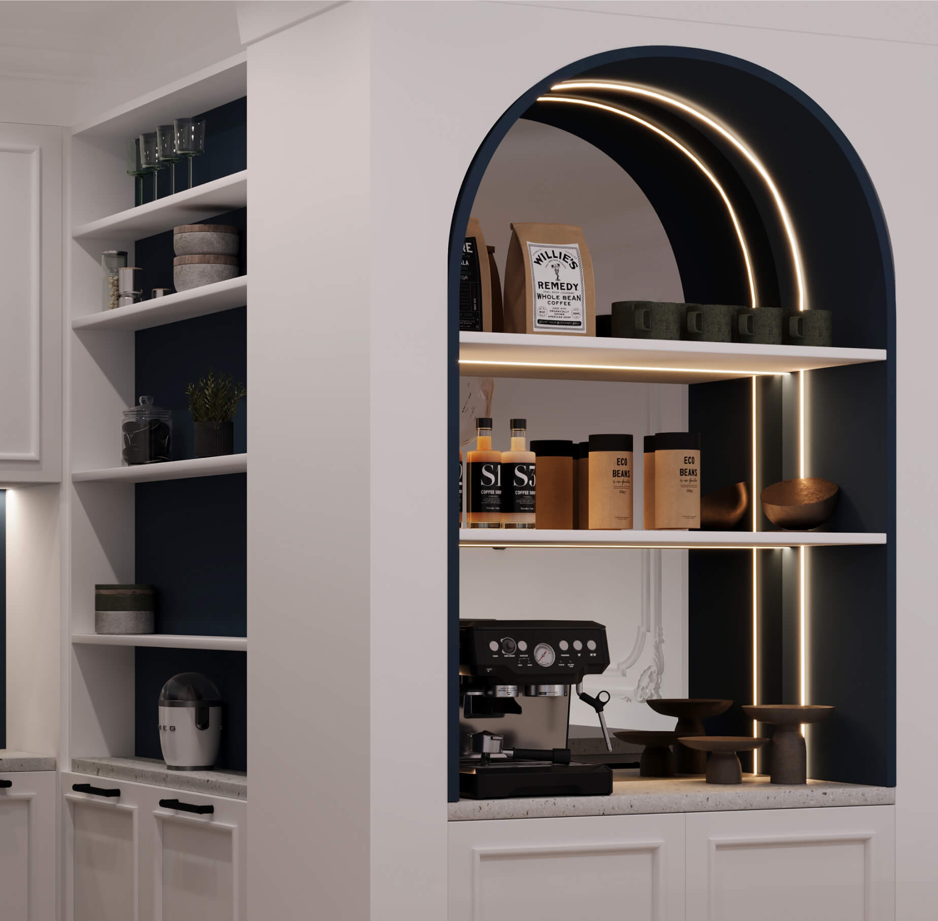 Ugrađene police sa ambijentalnim osvetljenjem naglašavaju detalje i materijale, dok tamni tonovi u unutrašnjosti niše stvaraju intimniju atmosferu.