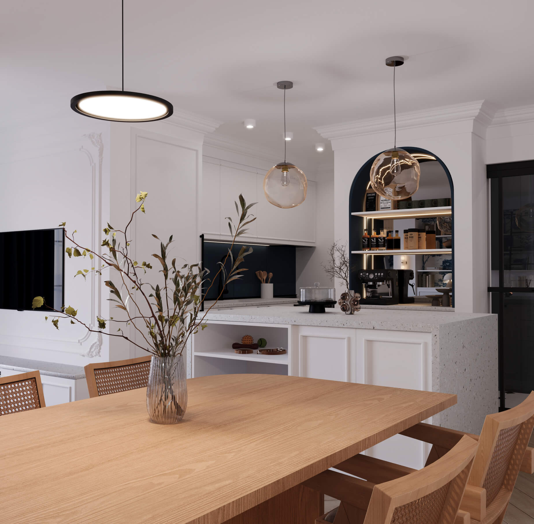 Trpezarijski deo, sa drvenim stolom i stolicama od prirodnih materijala, nadovezuje se na dnevni boravak i doprinosi osećaju kontinuiteta i topline.Kuhinjska niša, diskretno izdvojena lukom, osmišljena je kao mali ritualni kutak.