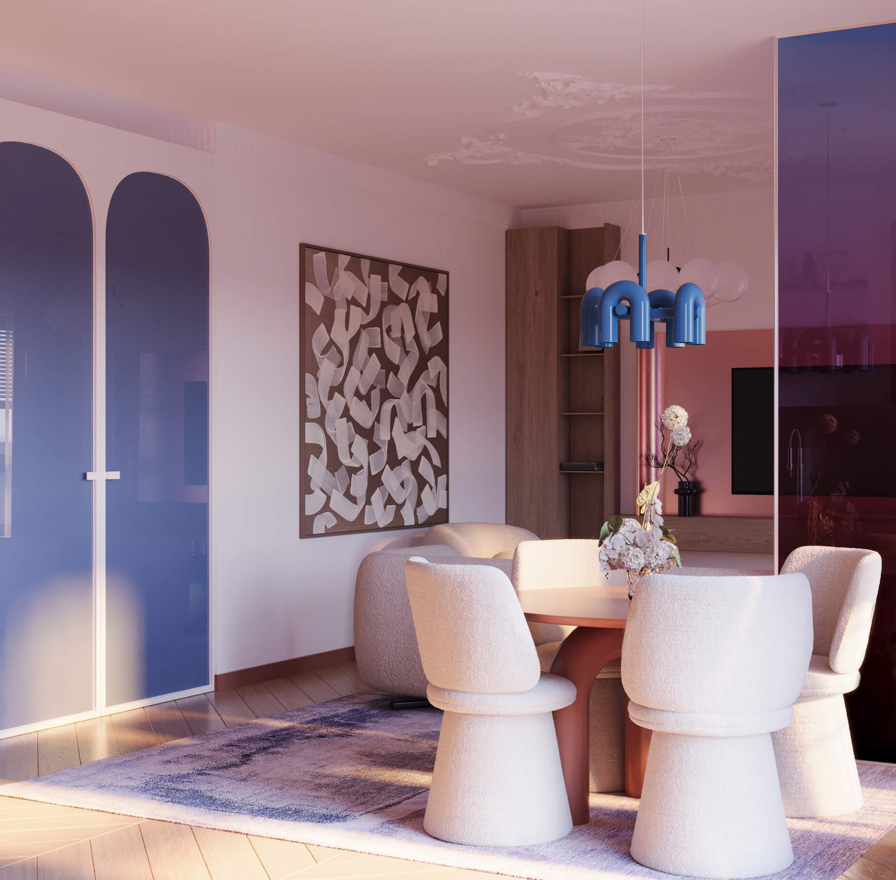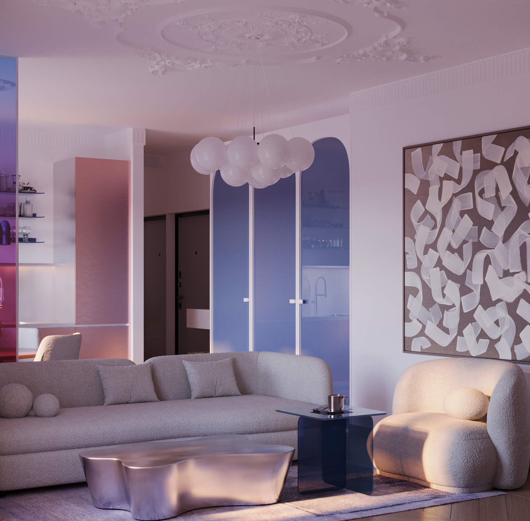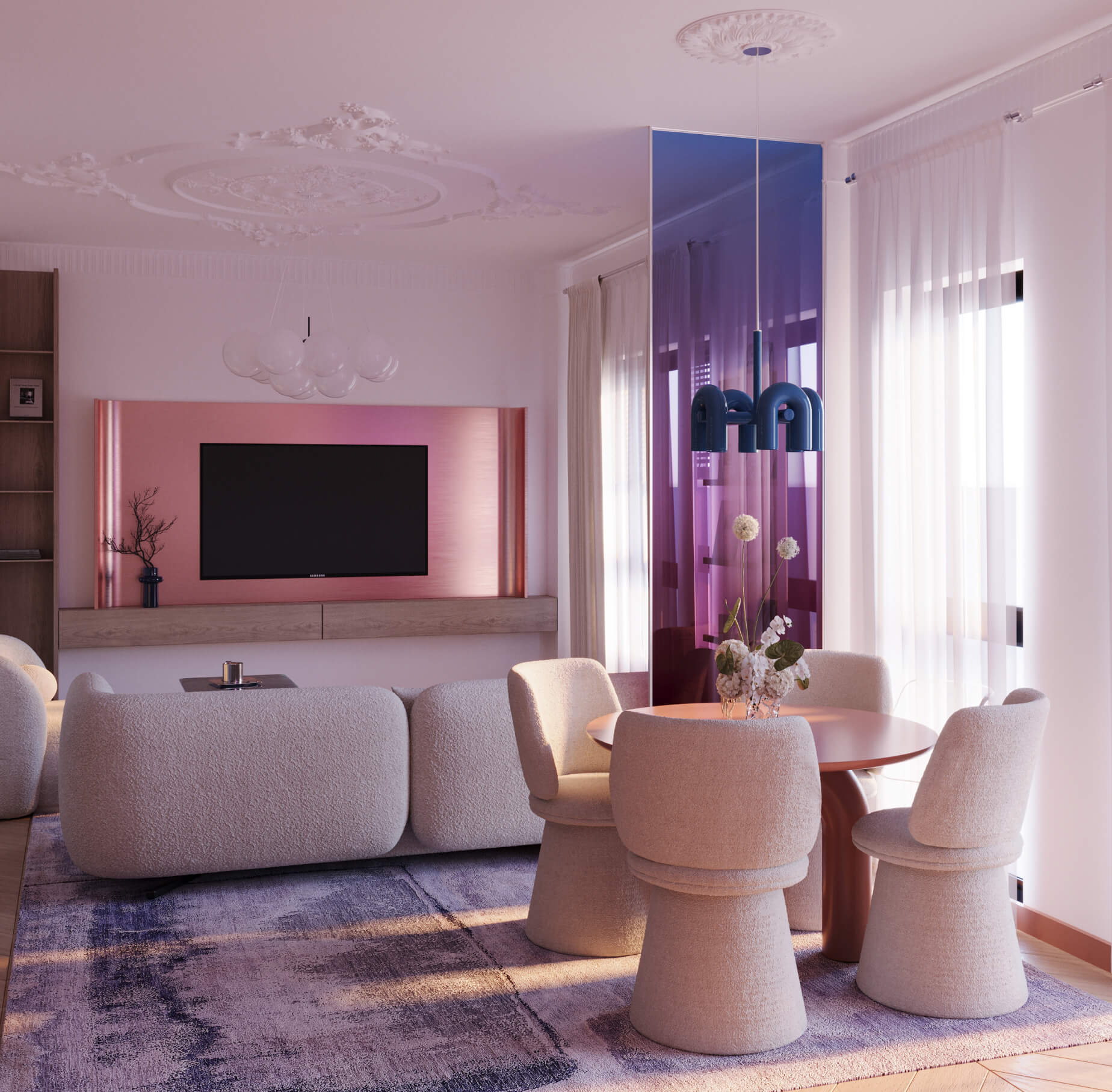 Tapacirani komadi nameštaja zaobljenih formi naglašavaju udobnost prostora, dok teksture tkanina i tepiha dodatno ublažavaju arhitektonske linije. Poseban akcenat predstavlja transparentna pregrada u nijansama plave i ljubičaste, koja prostor ne razdvaja već ga vizuelno obogaćuje. Ona uvodi slojevitost i dinamiku, pretvarajući dnevno svetlo u promenu tonaliteta tokom dana.