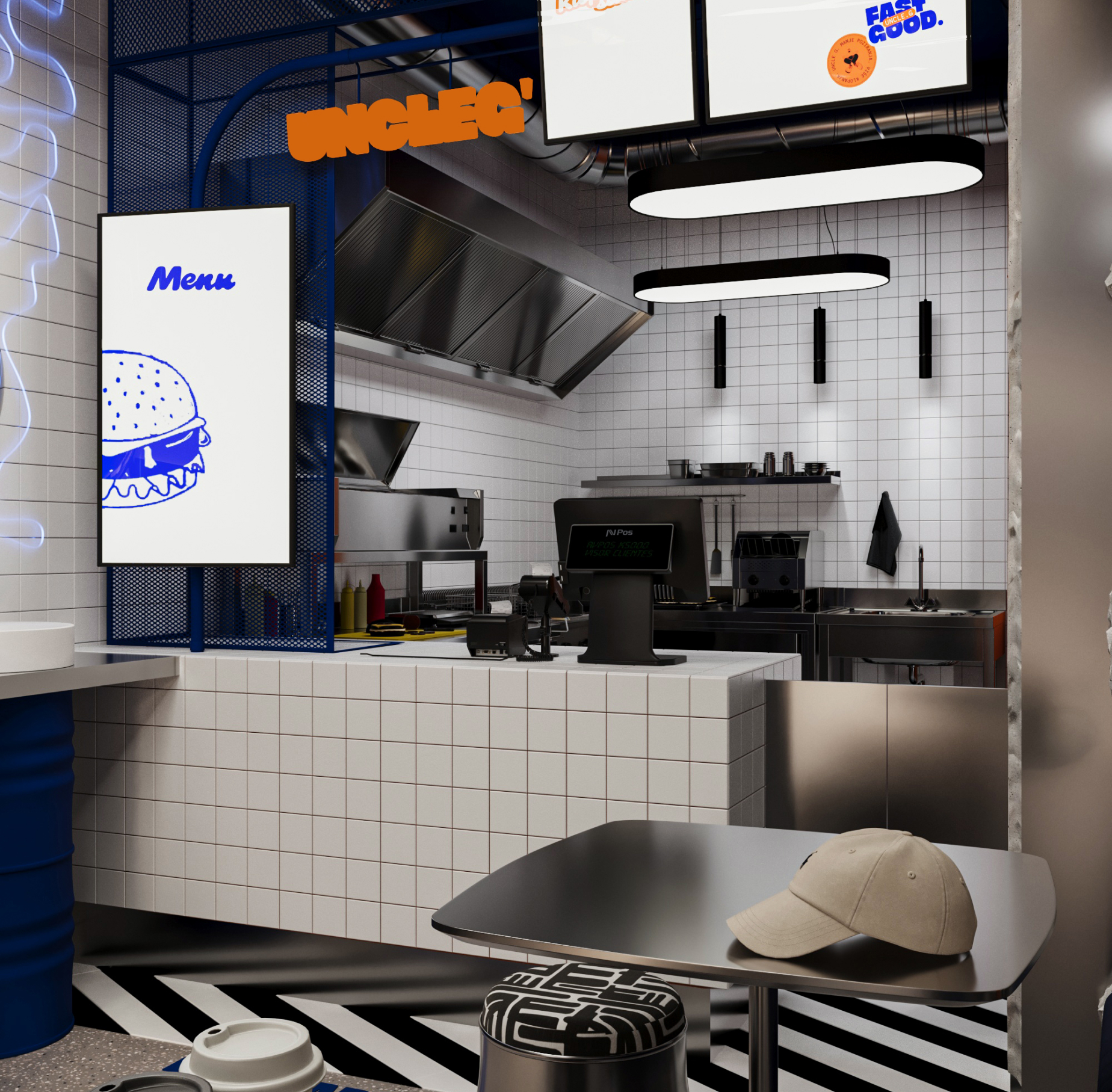 Prostor kombinuje Klein plavu, narandžastu, beton i aluminijum, stvarajući jasan identitet brenda. Velika visina lokala iskorišćena je za dominantan natpis G’LAB na plafonu, koji postaje centralni element i snažno obeležje enterijera.Kombinacija industrijskih materijala, čistih linija i vibrantnih akcenata daje prostoru energiju modernog street food bara sa laboratorijskim karakterom. “Uncle G - Lab” je mesto gde nastaju novi ukusi, a enterijer postavlja scenu za jedinstveno gastronomsko iskustvo.